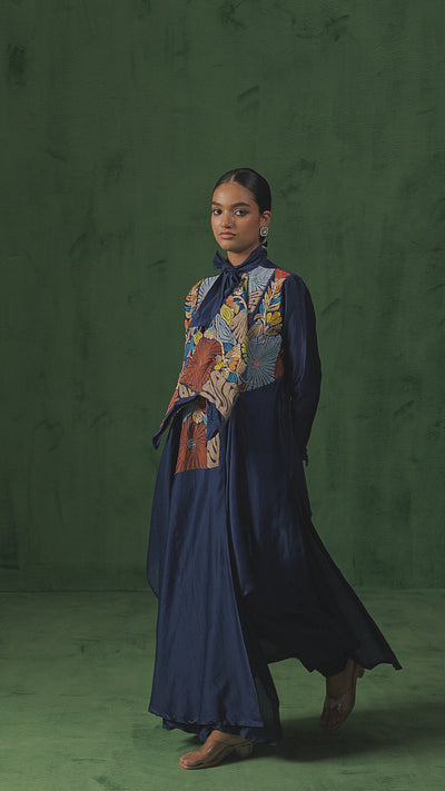 This elegant kurta pant set features an asymmetric premium silk kurta paired with raw silk pants, exuding a contemporary charm. The shrug-style design is adorned with intricate thread tassels in the front, sequins, and zari work, offering a vibrant, artistic flair.