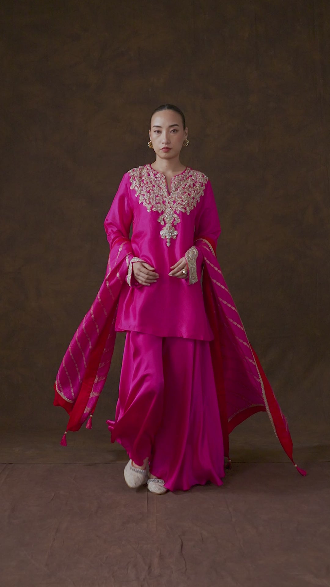 Shine bright in this spectacular Rich Pink Palazzo Set. This three-piece ensemble features a sleeveless raw silk kurta that is heavily embellished with intricate handwork, including zari, gota patti, and brocade details along the neckline, sides, and hem. The set is completed with a flowing, wide-legged satin silk palazzo and a coordinating dupatta, perfect for a grand event.