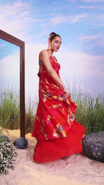 This vibrant Coral Orange kurta and palazzo set is crafted from lightweight georgette silk and features a striking oversized floral print. The set is beautifully accented with intricate beads and stone embellishments along the V-neckline and shoulder straps, offering a perfect blend of comfort and festive flair.