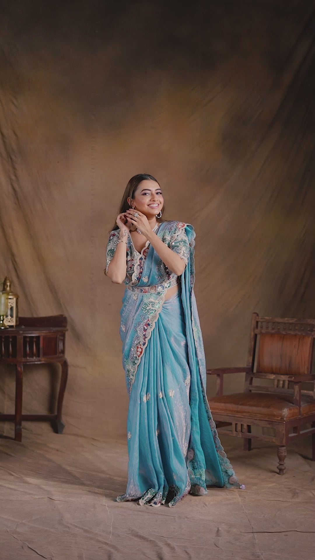 The Classic Sky-Blue Embellished Satin Silk Saree is a stunning blend of elegance and tradition, featuring intricate zari, aari tari, sequins, zardozi, beads and thread handwork. The saree is paired with a matching unstitched blouse beautifully adorned with detailed embellishments. A stylish embellished waist belt enhances the overall look, adding sophistication and charm. Perfect for festive occasions, this saree exudes grace and timeless beauty.