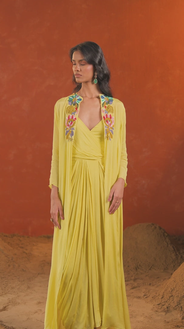 Lime Yellow Embroidered Chinon Silk Cape Dress With Jacket
