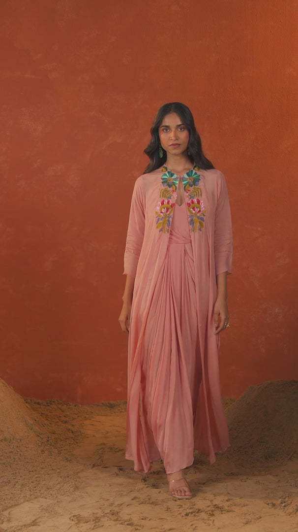 Rose Pink Embroidered Chinon Silk Cape Dress With Jacket