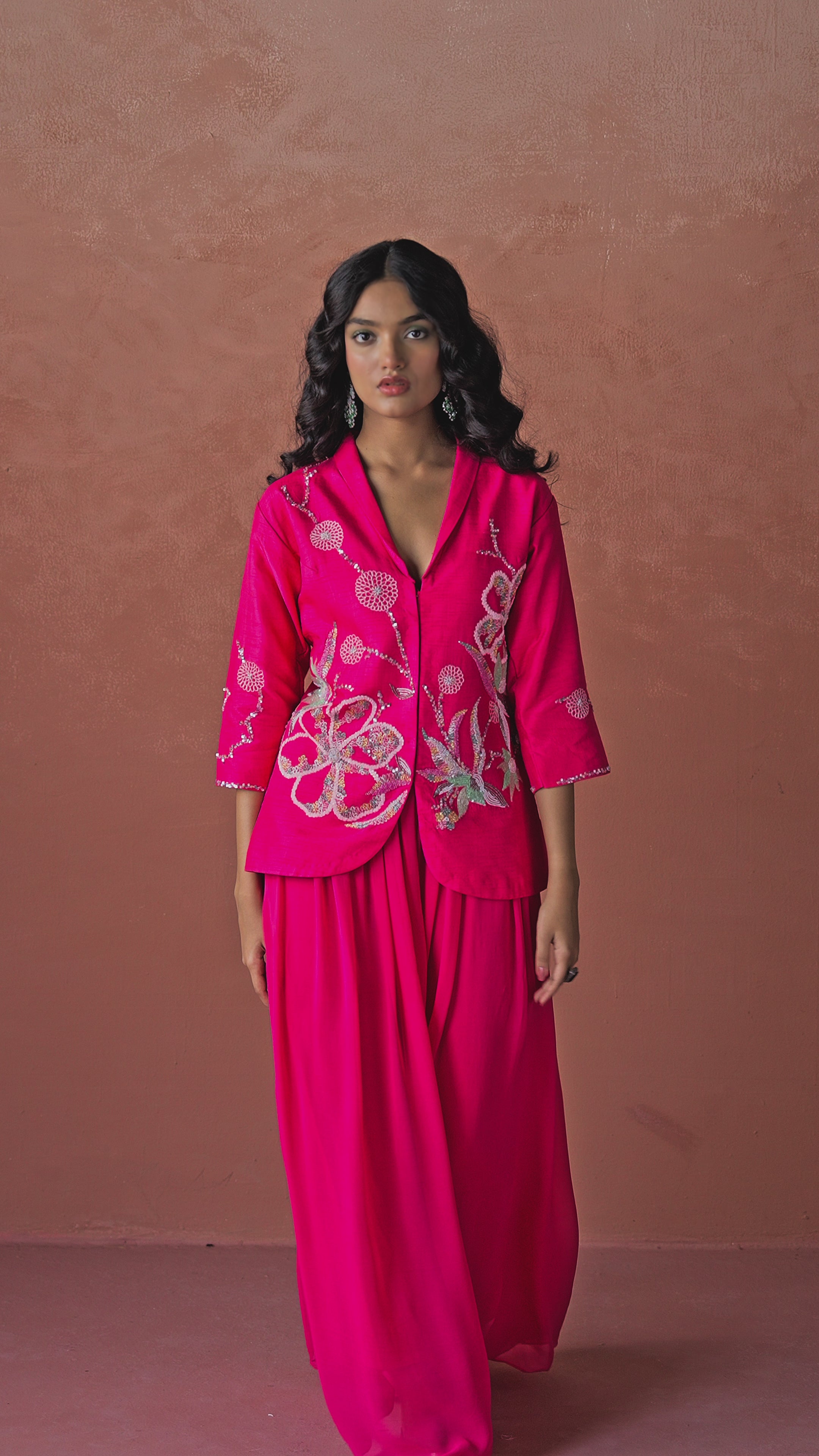 This striking Co-Ord set features a vibrant bright pink hue that effortlessly blends elegance and vibrancy. The jacket is crafted from luxurious raw silk and adorned with exquisite hand embroidery including sequins, beads, cut dana, and delicate thread work. Intricate floral and botanical motifs elevate the overall aesthetic. The tailored jacket is designed with a structured collar and pairs beautifully with a flowing georgette palazzo that adds grace and movement to the silhouette. Perfect for festive occasions this ensemble embodies refined craftsmanship and modern femininity.
