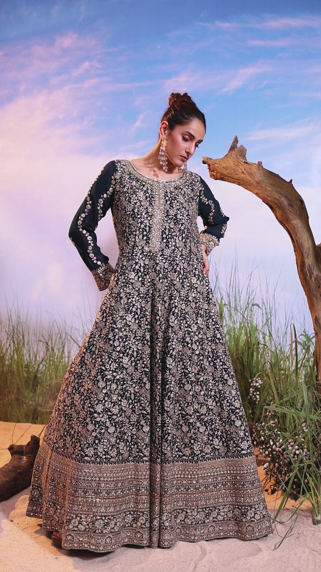 This spectacular single-piece Anarkali Gown is a true showstopper, ideal for grand weddings, receptions, or formal events. Crafted from flowing Georgette Silk (based on the drape), the full-sleeved gown is completely covered in intricate gold embroidery across its voluminous flared silhouette.