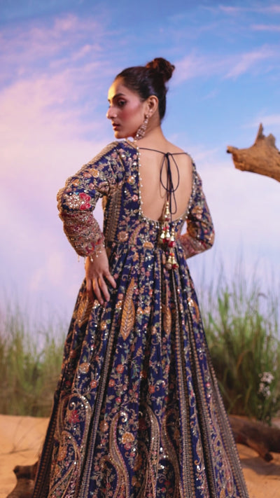 This spectacular single-piece Anarkali Gown is a true showstopper, ideal for grand weddings, receptions, or formal events. Crafted from flowing Chinon Silk, the full-sleeved gown features a rich, deep color fully adorned with intricate traditional prints and heavy hand-embellishment across its voluminous flared silhouette.