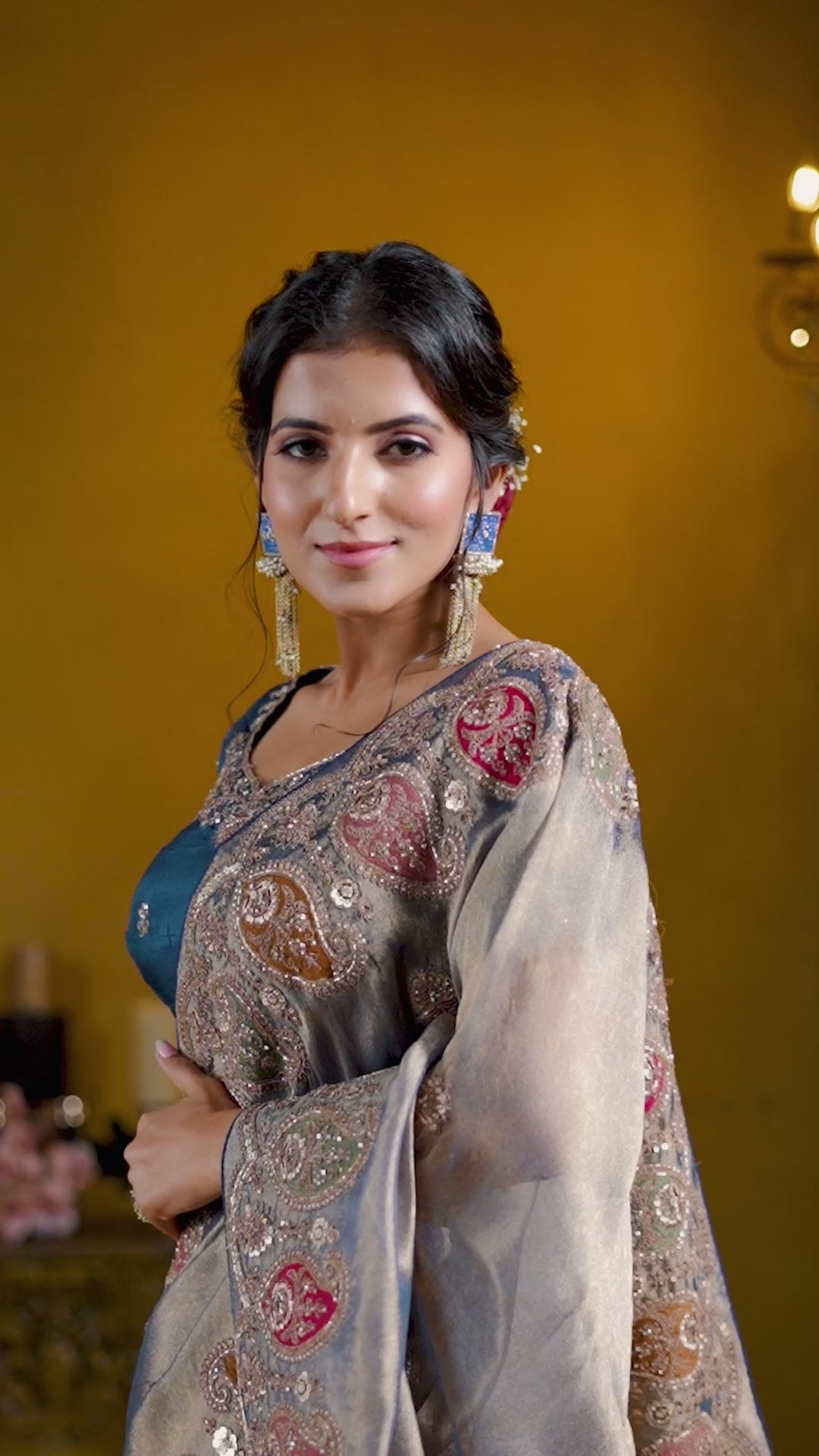 This Royal Metallic Teal Blue Embellished Premium Zari Silk Saree features exquisite Zari, sequins, aari tari, bead, stone and thread handwork, creating a luxurious and intricate design. The rich craftsmanship enhances the elegance of the saree. It is paired with a matching unstitched blouse, allowing for customization. This ensemble beautifully blends traditional artistry with a modern touch for a sophisticated and graceful look.