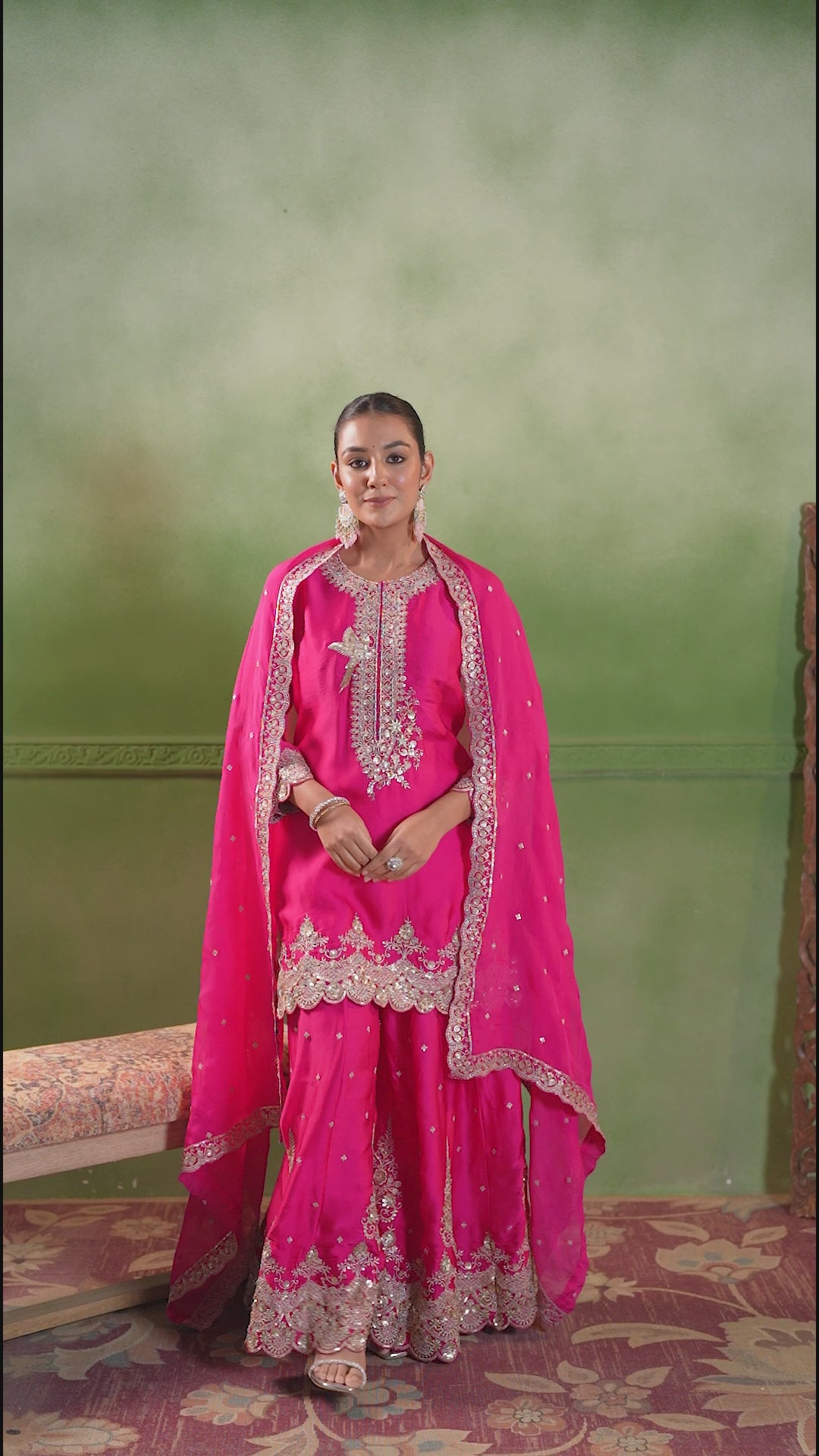 Raspberry Pink Embellished Satin Silk Sharara Set