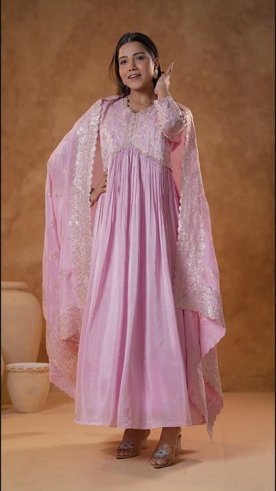 Soft Pink Embellished Tissue Silk Anarkali Set