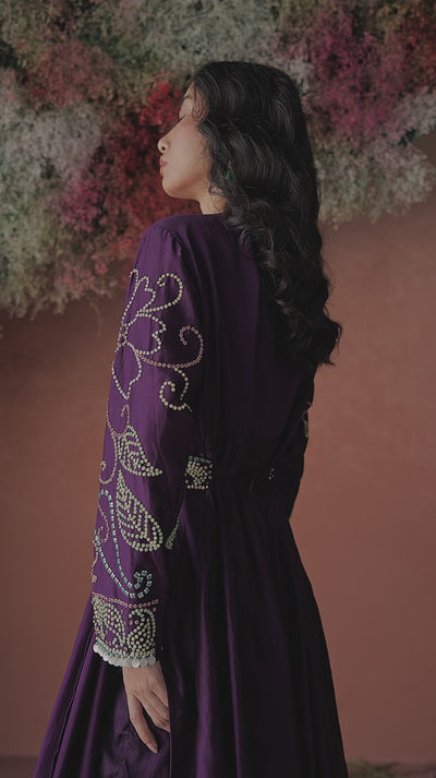 This premium silk asymmetrical kurta and pant set comes in a royal purple hue, paired with an intricately embellished belt. Featuring delicate sequin, bead, and mirror work, it beautifully blends traditional craftsmanship with a modern silhouette — perfect for statement festive dressing.