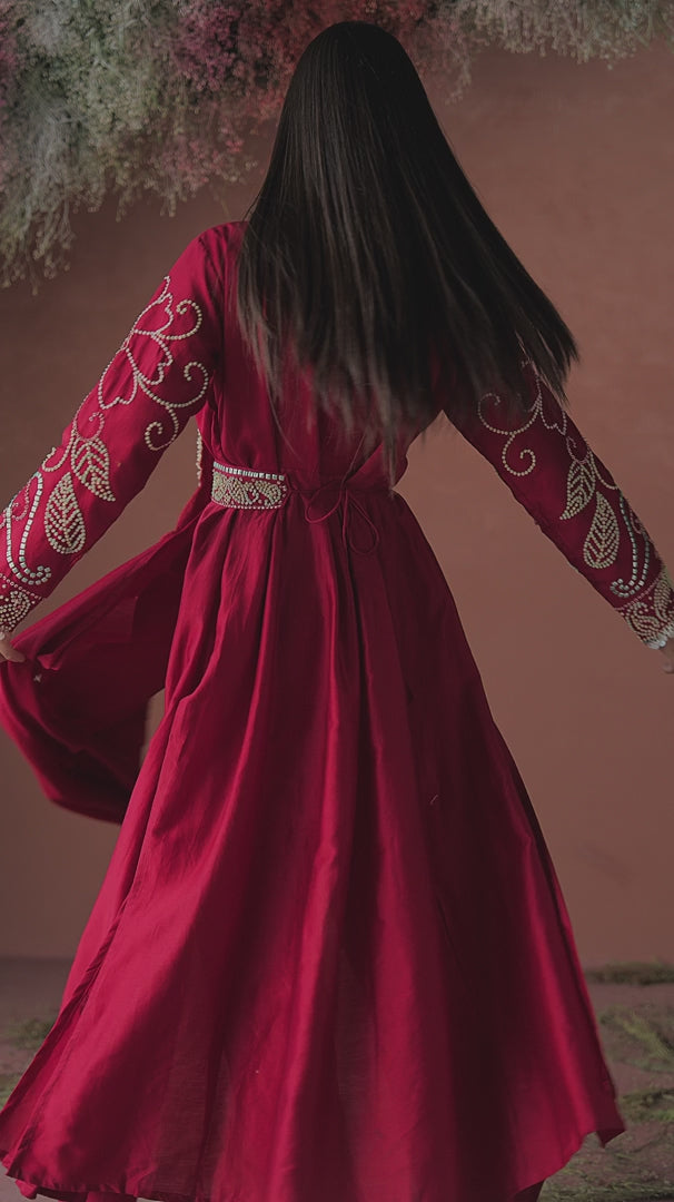 This premium silk asymmetrical kurta and pant set in a striking carmine red is paired with a heavily embellished belt. Adorned with intricate sequin, bead, and mirror work, the ensemble perfectly balances festive flair with modern elegance.