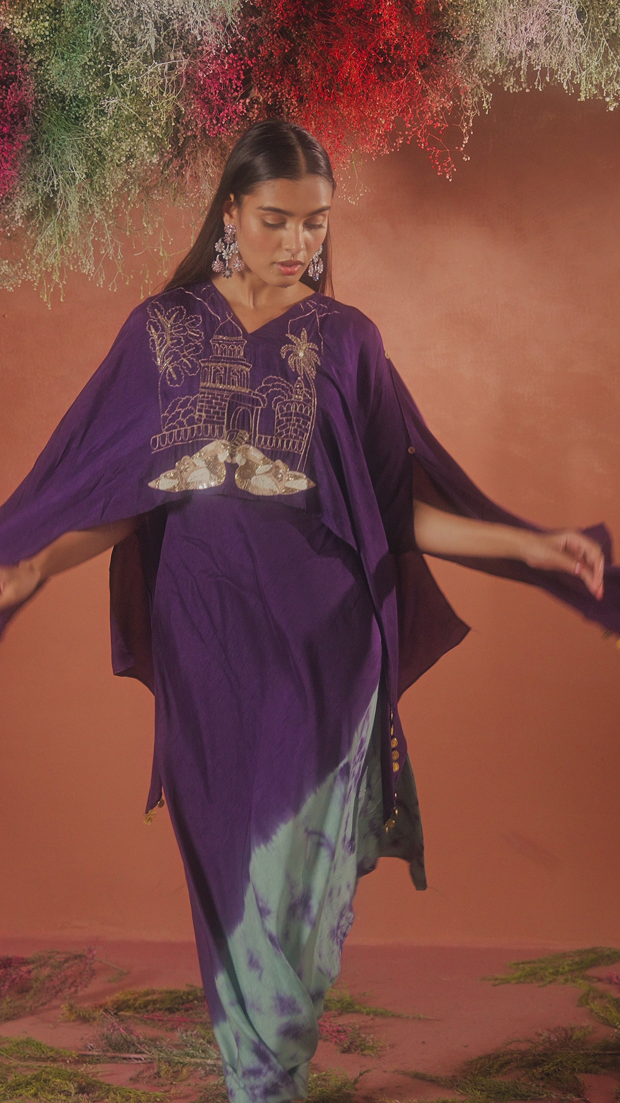 A stunning raw silk asymmetrical kaftan set featuring intricate sequin, bead, cut-dana, and thread embroidery. The outfit is elevated with a striking purple and mint tie-dye drape, blending tradition with modern elegance. The flowy silhouette and statement embroidery make it perfect for weddings, festive occasions.