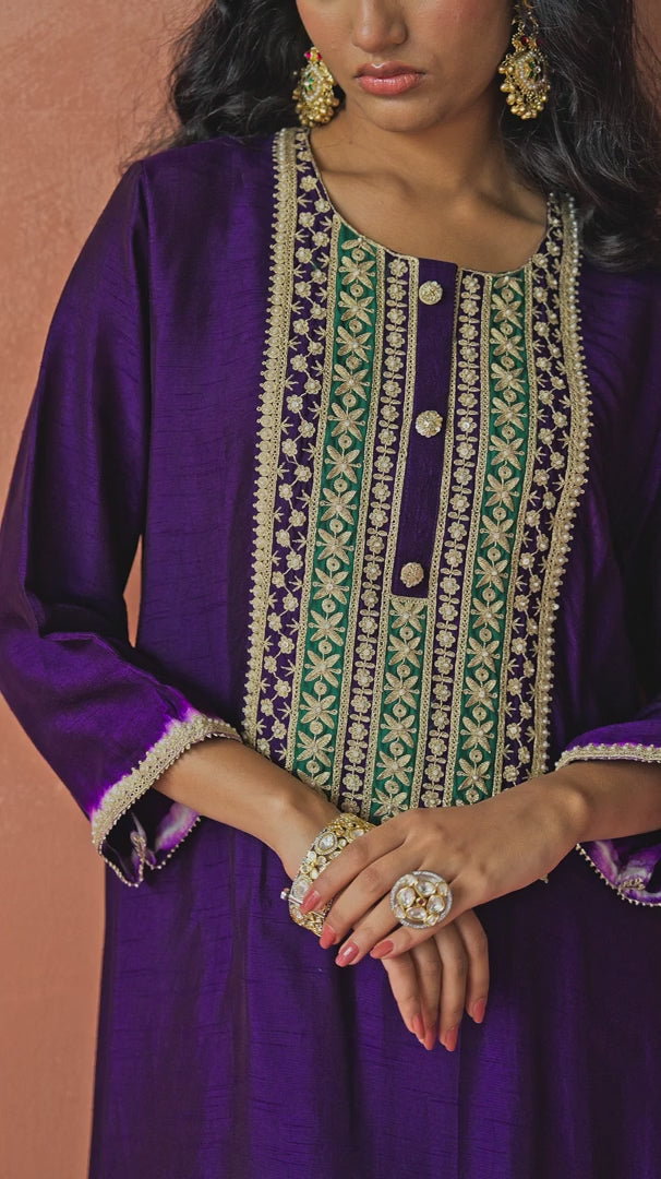 Purple dyed raw silk asymmetric kurta, thoughtfully designed to blend traditional craftsmanship with modern elegance. The silhouette features exquisite sequin, bead, golden thread, and intricate zari work delicately woven around the neckline, creating a striking focal point. Crafted from luxurious raw silk, the kurta flows gracefully with an asymmetric hem that adds contemporary flair.