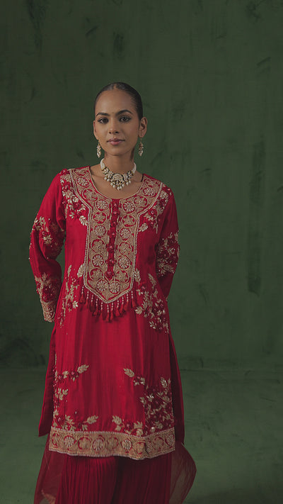 The kurta is paired with a plain solid chinon silk sharara, offering graceful movement and a rich texture contrast. Completing the ensemble is a light organza dupatta, delicately highlighted with sequins, thread, zari, and bead work, adding subtle elegance. Perfect for festive occasions, this set beautifully blends tradition with modern flair.