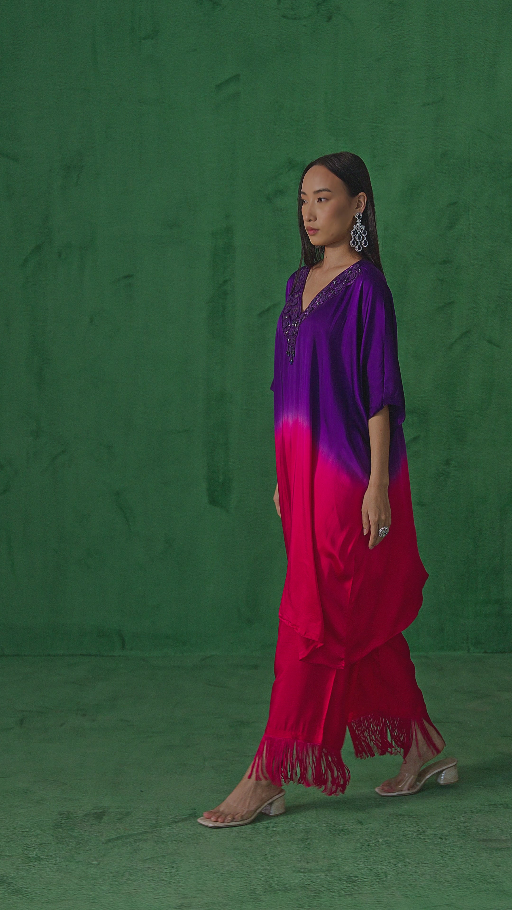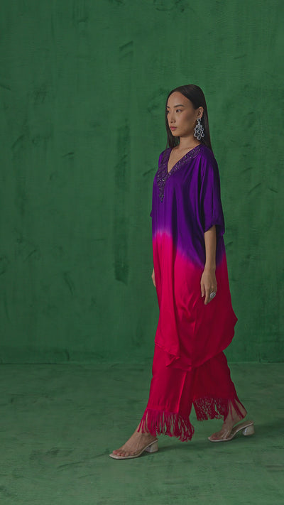 This stunning ombre kaftan set features a luxurious satin silk fabric with a deep purple to rani pink gradient. The neckline is adorned with intricate floral motif embellishments crafted using cut dana and sequins for a statement look. Paired with raw silk palazzo pants finished with fringe detailing, this ensemble beautifully blends elegance and contemporary flair.