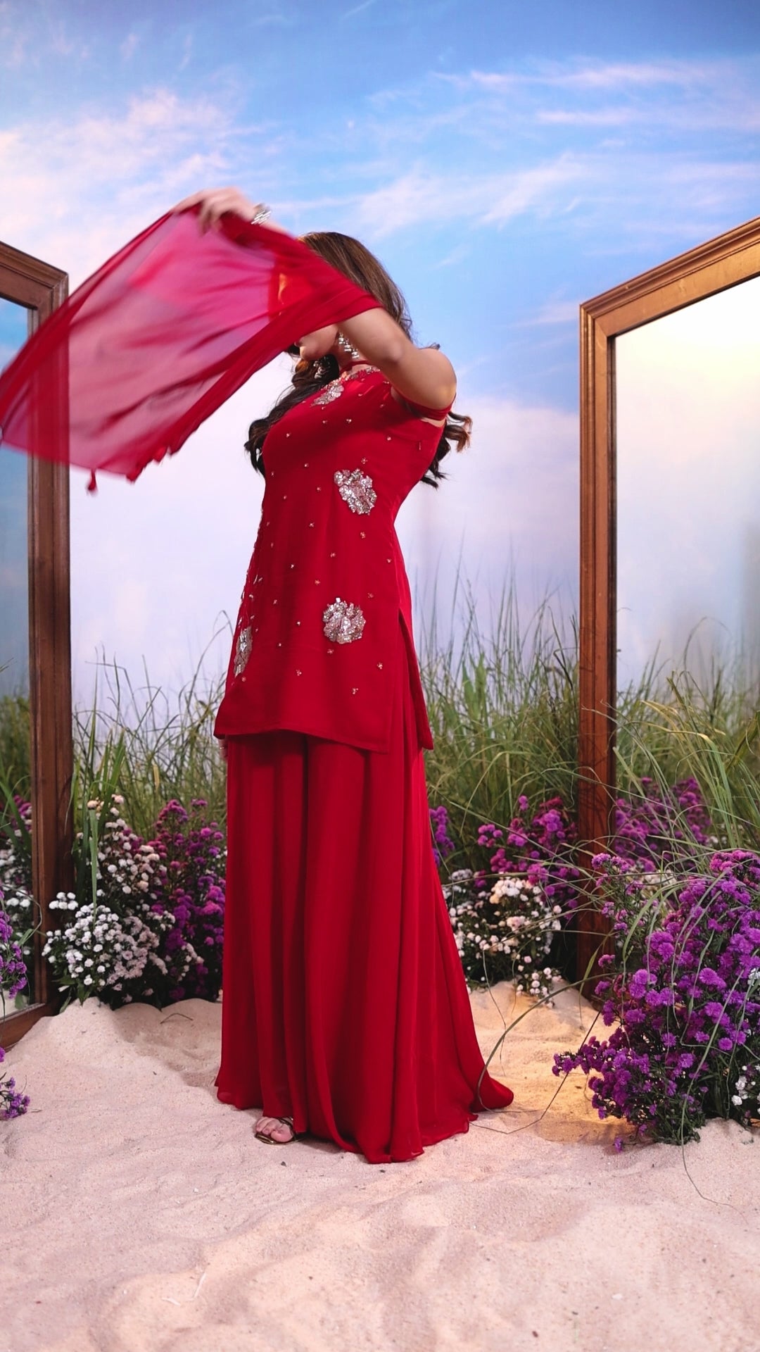 Ruby Red Embellished Georgette Silk Palazzo Set