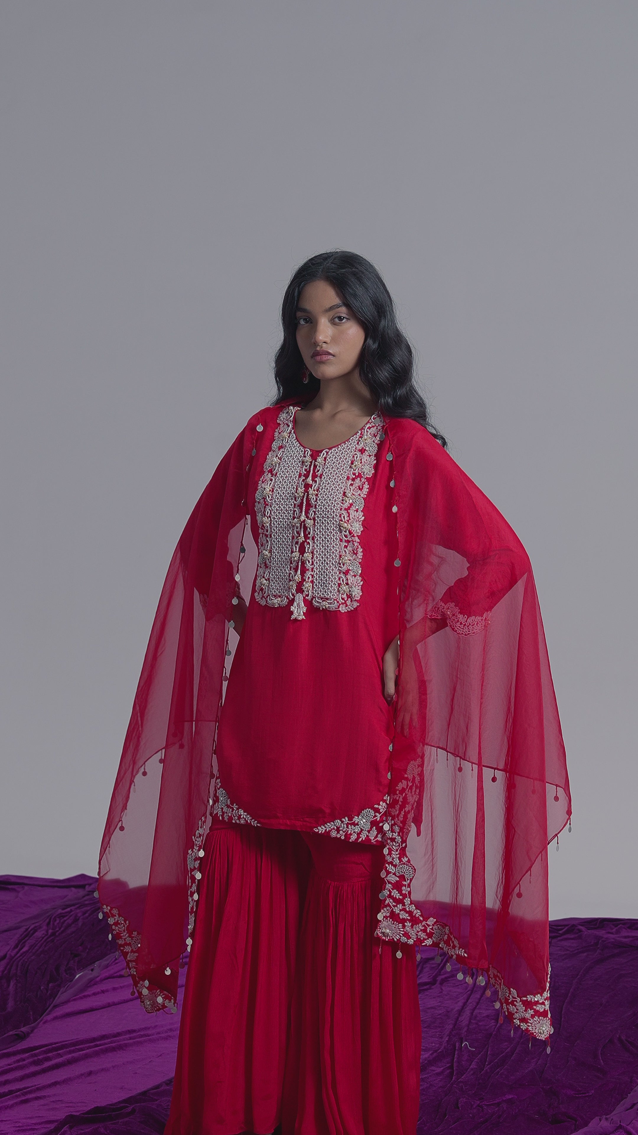 This stunning raw silk kurta and sharara set is a perfect blend of traditional elegance and contemporary charm. The intricate zari, thread work, sequins, and bead embellishments add a luxurious texture to the rich fabric. Paired with an organza silk dupatta adorned with delicate embroidery and shimmering details, this ensemble is ideal for festive occasions and special celebrations.