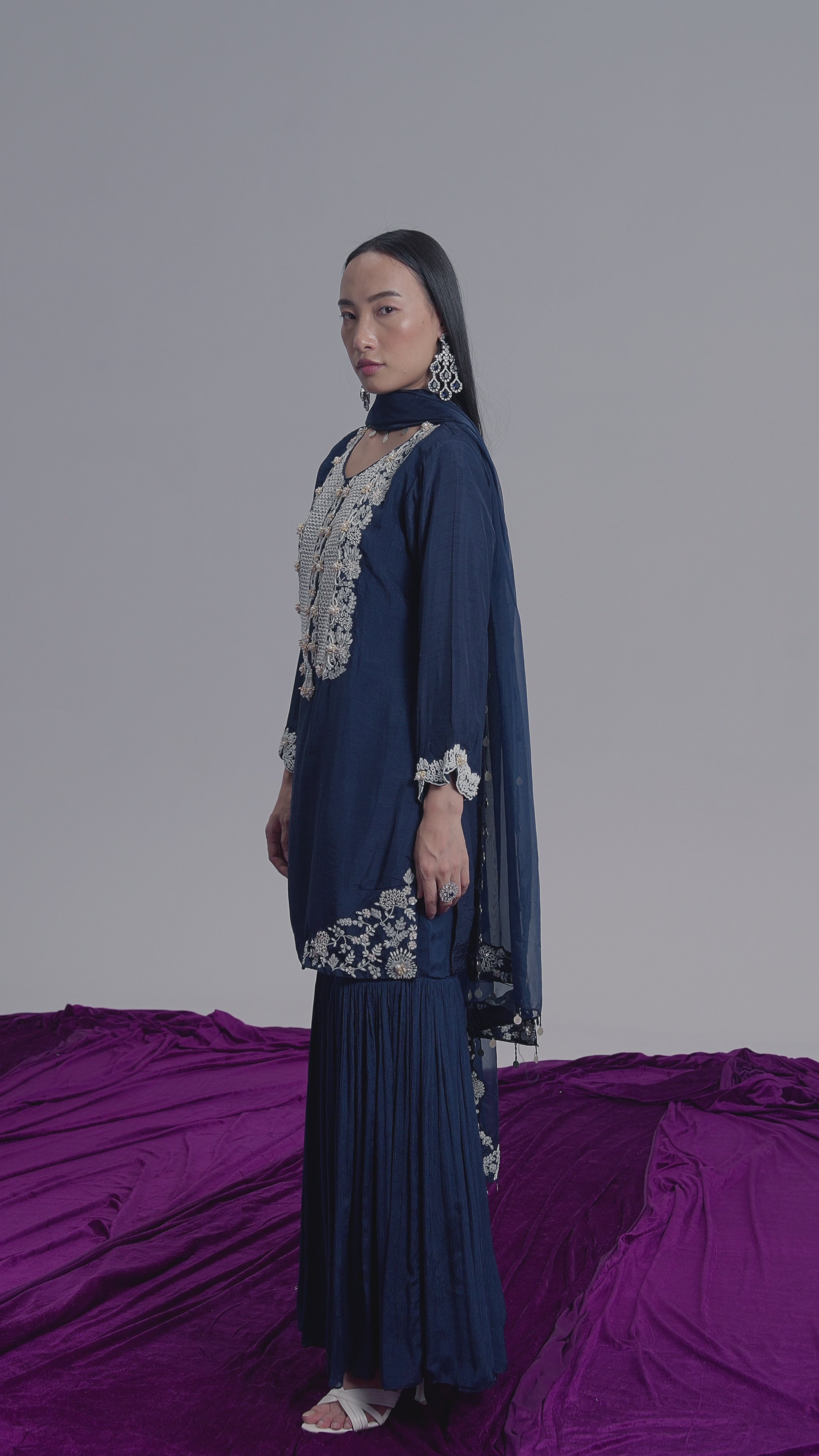This stunning deep indigo ensemble features a raw silk kurta paired with a flowing sharara, complemented by an organza silk dupatta. The outfit is richly embellished with intricate zari, sequins, threadwork, and delicate bead detailing. Perfect for festive and special occasions, it combines traditional artistry with a modern silhouette for a graceful look.