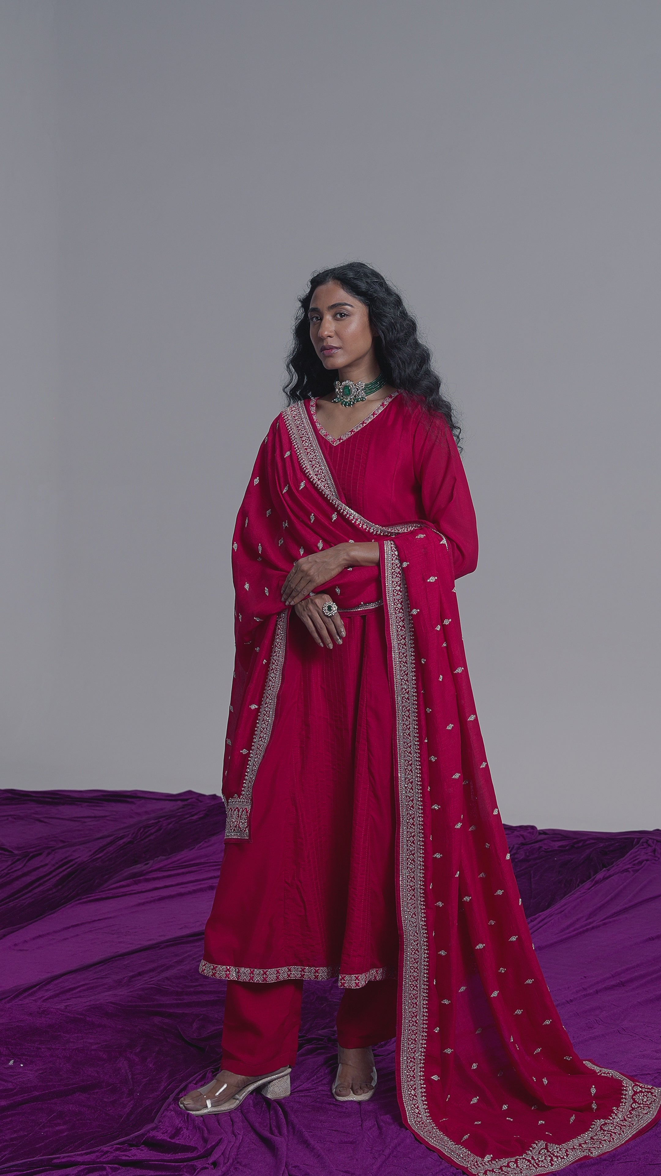 This elegant magenta rose set features a Chinon silk kurta, pant, and dupatta, radiating festive charm. The ensemble is exquisitely embellished with delicate sequins, shimmering stones, and intricate golden thread work. The rich color and luxurious texture make it perfect for traditional celebrations or evening soirées.