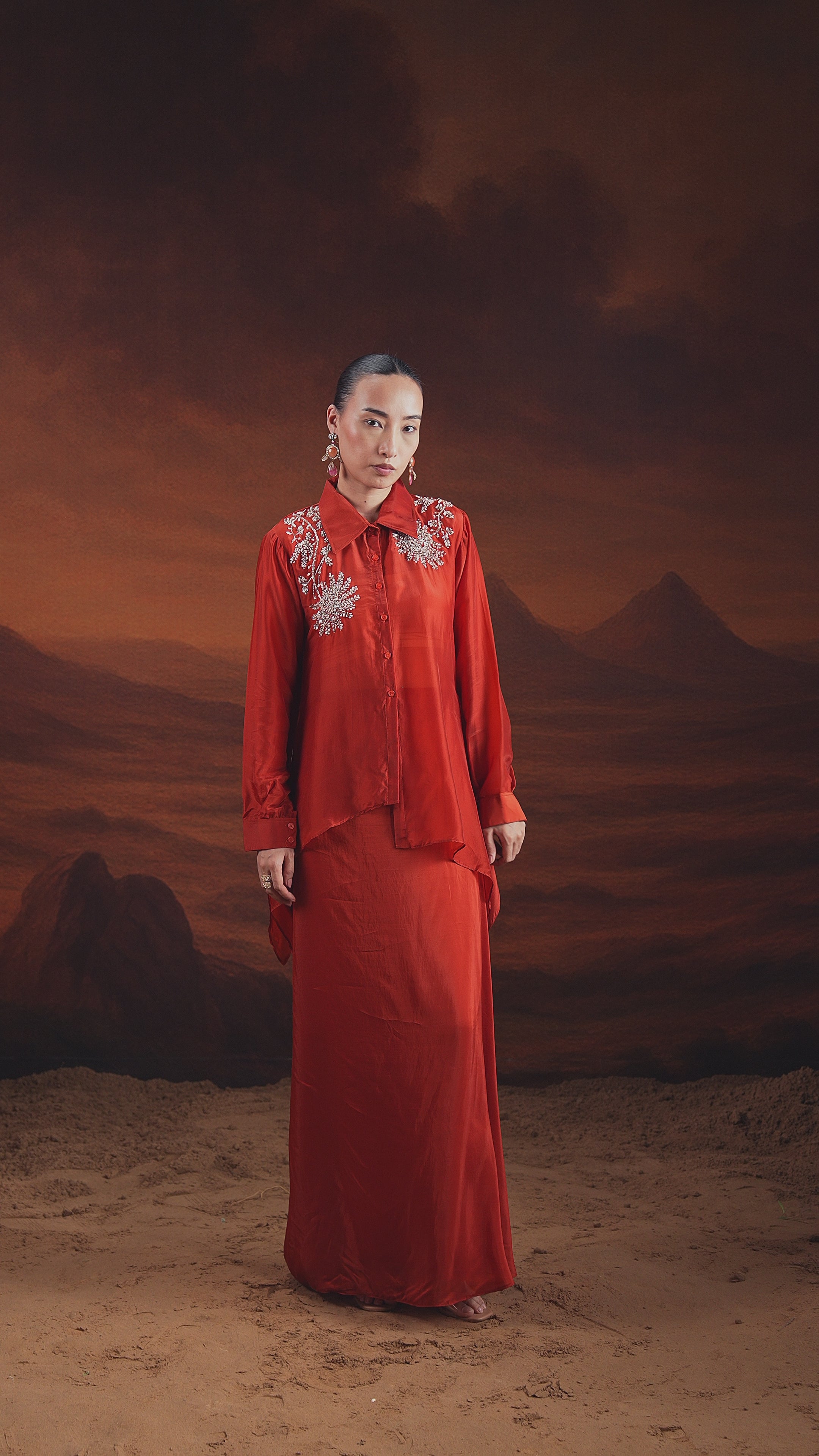 Make a sophisticated statement in this elegant Rust Orange Skirt and Kurta Set. Crafted from lustrous satin silk, the kurta features an asymmetrical hem and a collar beautifully adorned with intricate sequin, bead, and cut dana handwork. It's perfectly complemented by a flowing matching skirt for an effortlessly graceful look.