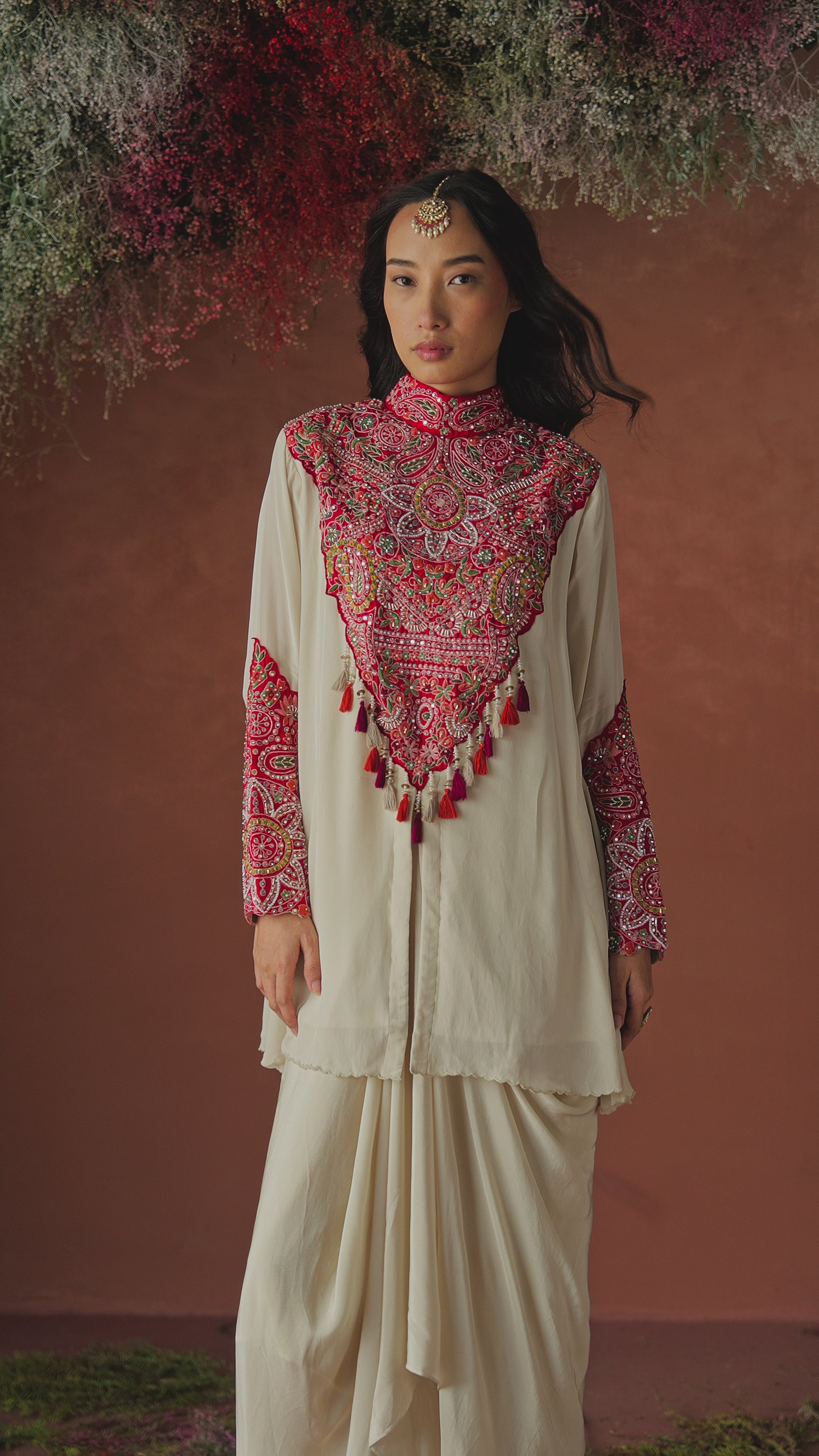 This Chinon silk skirt and kurta set is a vibrant fusion of elegance and craftsmanship. The drape skirt pairs beautifully with a richly embroidered kurta, adorned with cut dhana, shimmering beads, stones, and intricate threadwork. Lightweight yet festive, it’s designed to make a graceful statement at any celebration. A perfect blend of tradition and modern flair.