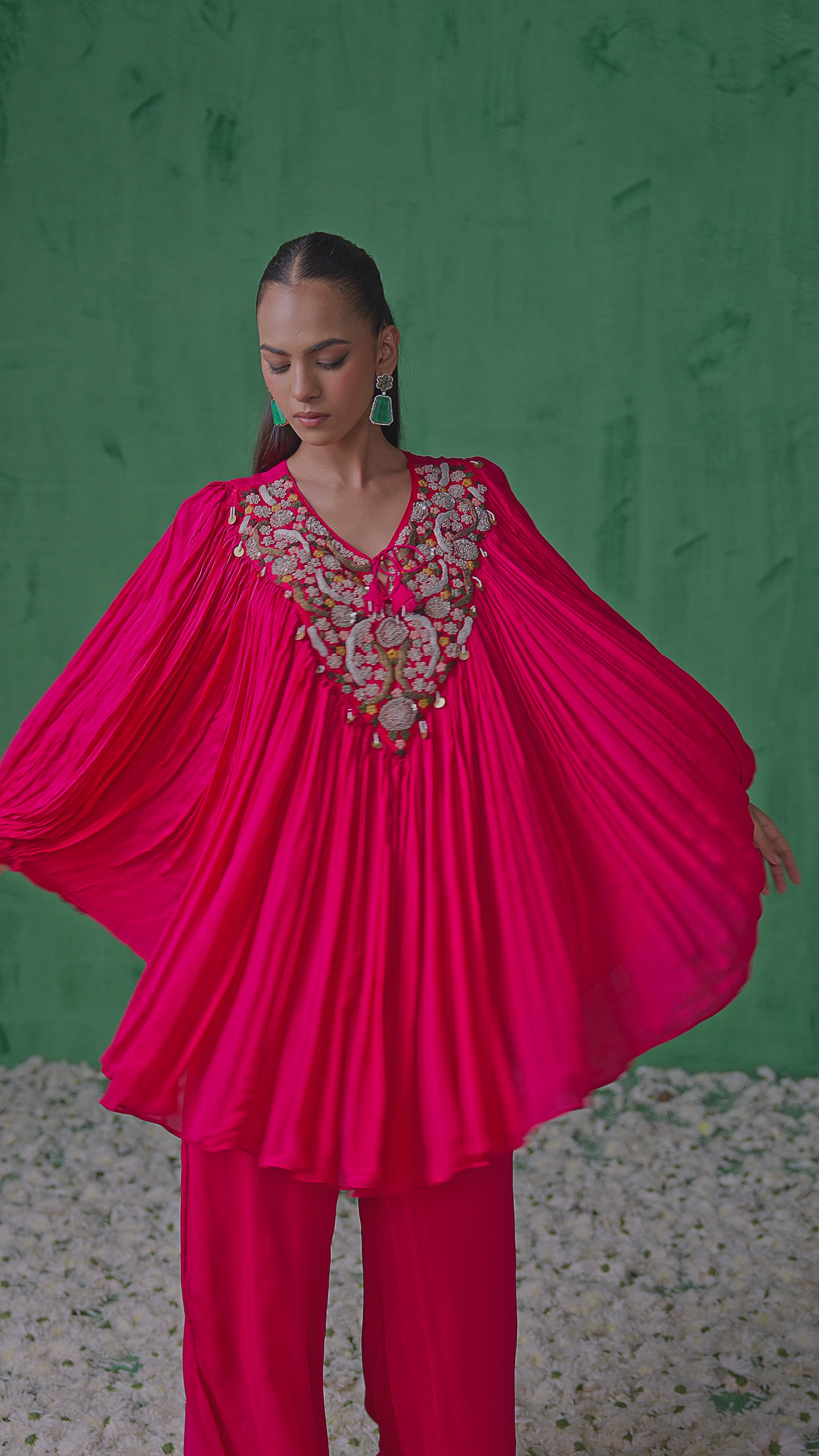 Raspberry Pink Embellished Chinon Silk Kaftan Co-Ord