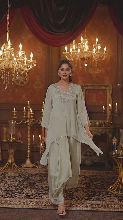 Embrace ethereal grace in this serene Sage Green Skirt Set. This two-piece ensemble, crafted from flowing Chinon silk, features an asymmetrical high-low kurta with elegant bell sleeves. The V-neckline is exquisitely embellished and is paired with a beautifully draped skirt, creating a layered and contemporary silhouette.