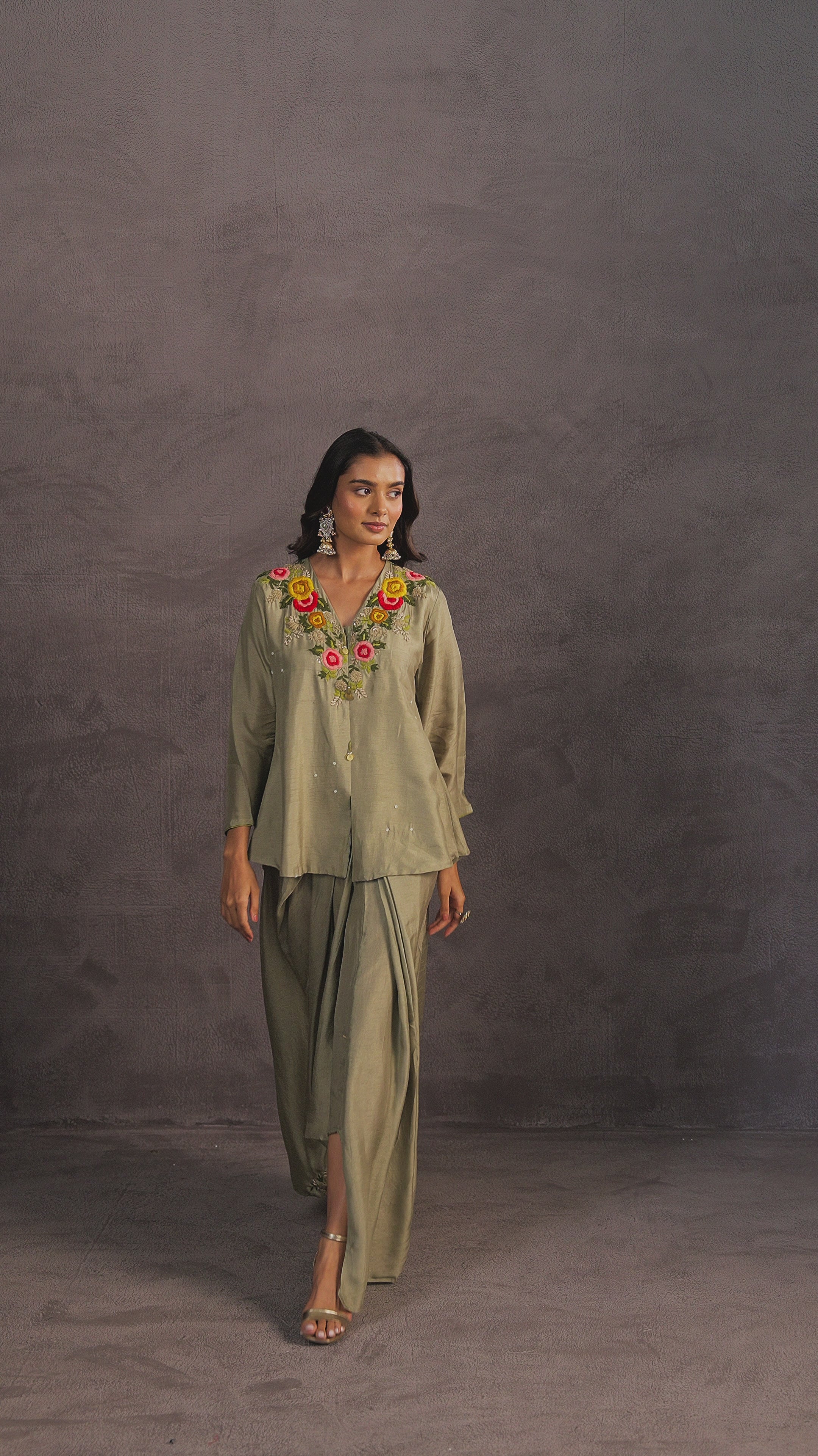 Crafted in luxurious raw silk, this sage green set features intricate floral thread embroidery highlighted with sequins and fine detailing. The look is completed with a stylishly draped skirt, making it perfect for festive gatherings or intimate celebrations.