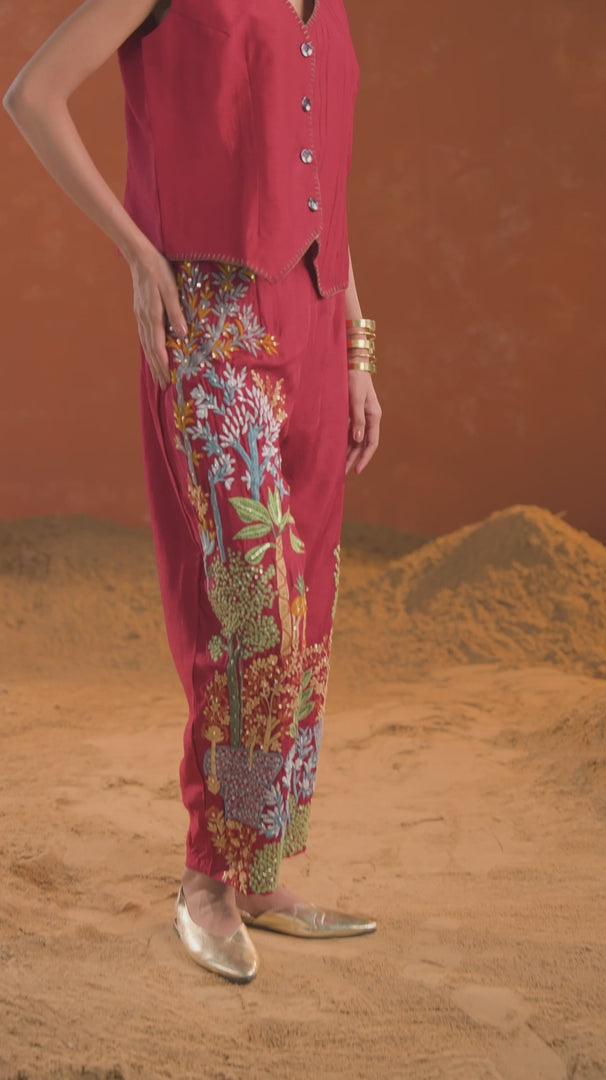 This stunning scarlet red co-ord set is crafted in luxurious raw silk fabric, offering a rich texture and vibrant appeal. The ensemble features elaborate embroidery and sequin work that brings to life scenic flora and fauna motifs on the pants. The sleeveless V-neck top with button detailing adds a contemporary twist to the traditional craftsmanship.