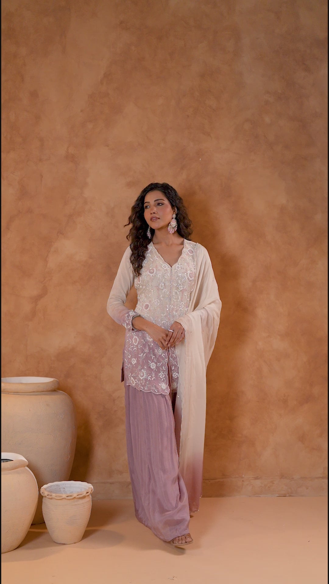 Exude serene sophistication in this beautiful Shaded Mauve Sharara Set. The set features a flowing kurta, expertly blending Ivory and Dusty Mauve tones, and a matching voluminous sharara, all crafted from soft Chinon silk. The ensemble is exquisitely detailed with intricate white cut-dana, threadwork, and pearl hand embellishments, beautifully complemented by a sheer ombre organza dupatta.