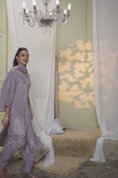 Work & Design: This ensemble features a meticulously hand-embellished neckline and border showcasing a fusion of pearls, stones, cut-dana, and sequins. The longline kurta is further accented with a delicate dangler detail on the sleeves and intricate floral motifs scattered across the bodice.