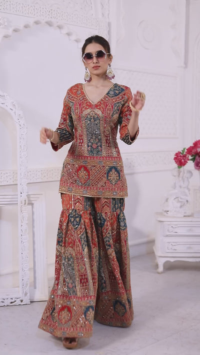 Rustic Red Traditional Work Sharara Set