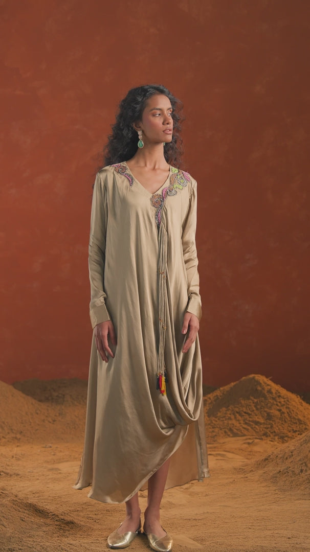 A flowing satin silk dress adorned with exquisite hand embroidery and vibrant tassels, radiating timeless elegance.