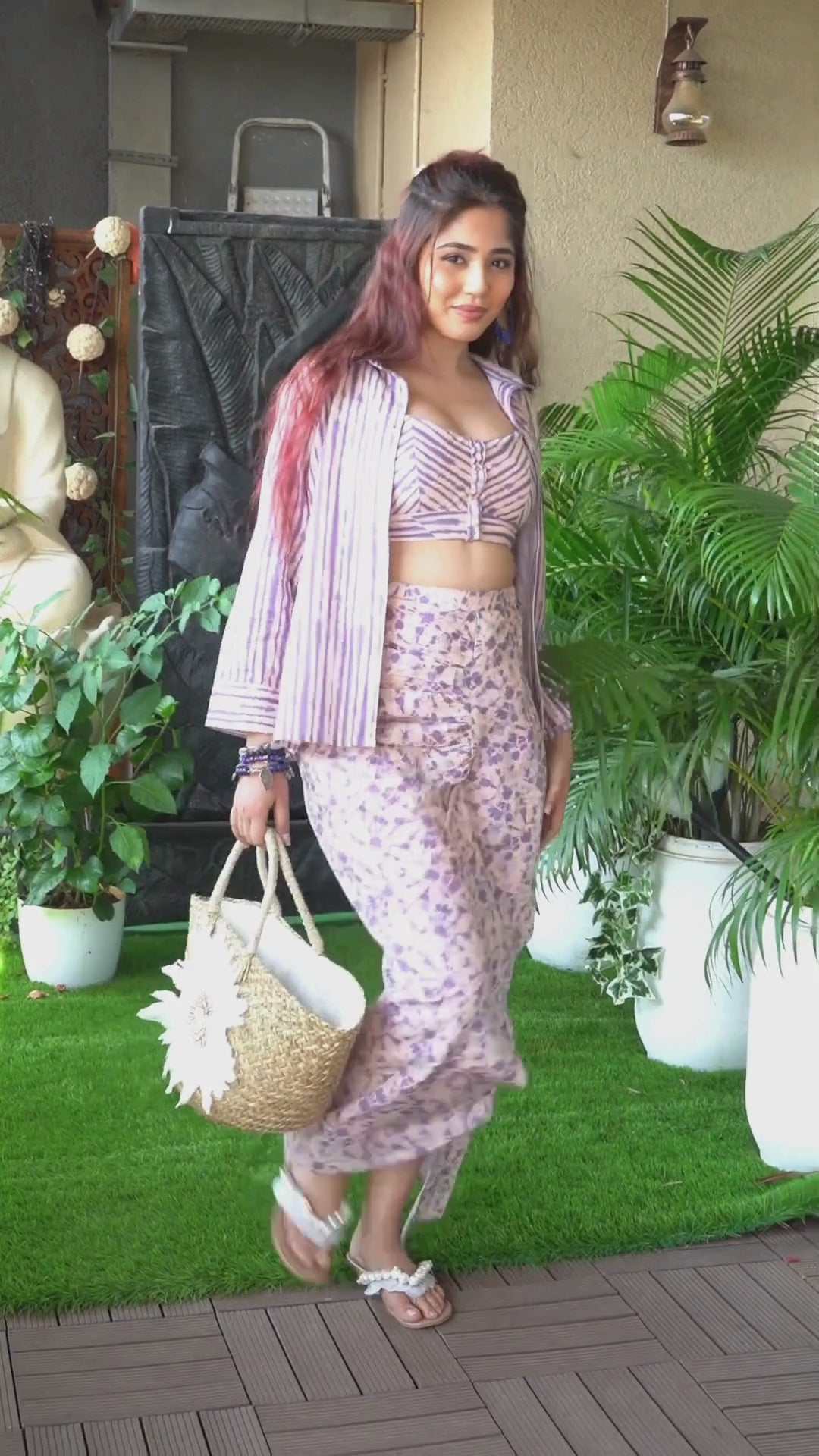 - It comes with a crop top, shrug and a side slit skirt.