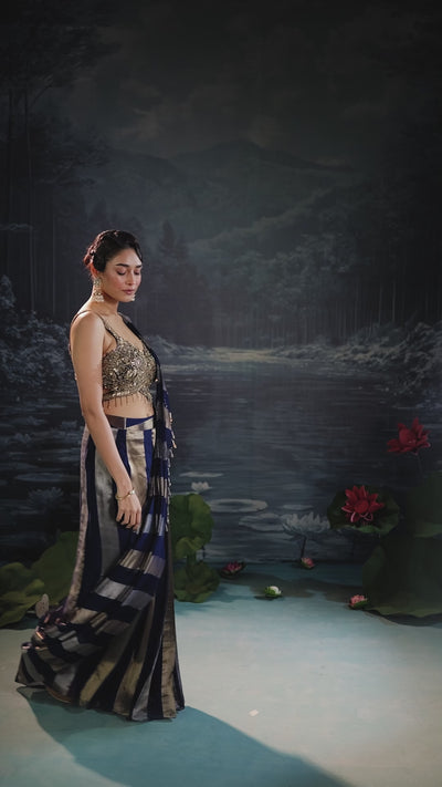 This contemporary look features a striking shimmer tissue silk saree in a bold striped pattern of rich navy blue and metallic gold. The ensemble is anchored by a heavily embellished blouse that dazzles with intricate work using sequins, beads, and cut dana. It's a glamorous and modern take on traditional dressing, perfect for a grand event.