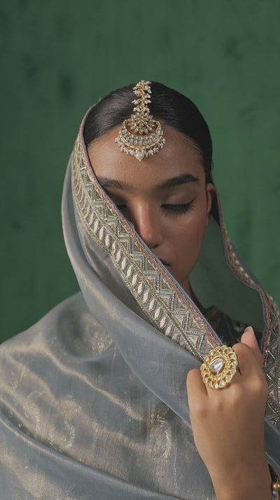 A regal Shimmer Organza ensemble in slate grey, featuring a heavily embellished kurta, paired with a solid pant and bordered dupatta for a classic festive silhouette.