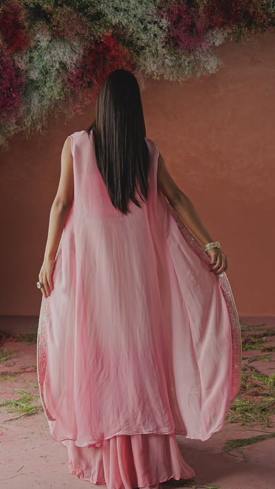 A soft pink ensemble that exudes grace and charm, this set features a delicately embellished crop top paired with an ombre georgette silk pleated skirt. The look is elevated with a sheer organza cape shrug, adding flow and femininity. Intricate handwork using sequins, cut dana, and beads lends a subtle sparkle, perfect for dreamy occasions.