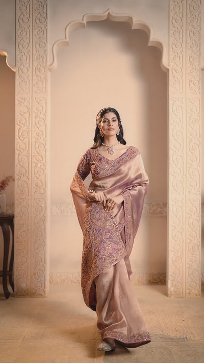 This elegant soft purple saree is crafted from luxurious jacquard silk, offering a rich texture and graceful drape. Enhanced with intricate position prints, delicate embroidery, and refined handwork, the saree exudes sophisticated charm. Paired with a matching purple blouse, this ensemble creates a cohesive, elegant look—perfect for weddings, festive celebrations, and special occasions.
