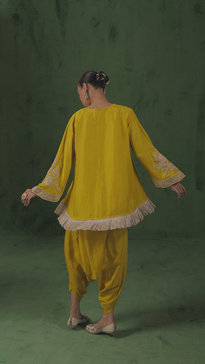 Step into effortless elegance with this vibrant Yellow Raw Silk Co-ord Set, a perfect fusion of modern flair and timeless tradition. The kurta is adorned with delicate embroidery and tassel accents, while the cowl pants and thread lace add a contemporary twist for a statement look that turns heads at any celebration.