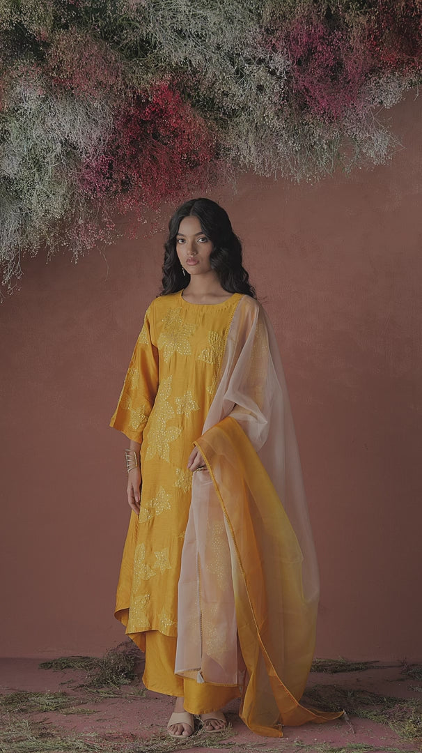 Bring a touch of effortless charm to your festive wardrobe with this Mustard Yellow Raw Silk Set. Enhanced with delicate sequin, bead, and patchwork detailing, this ensemble strikes the perfect balance of elegance and comfort.