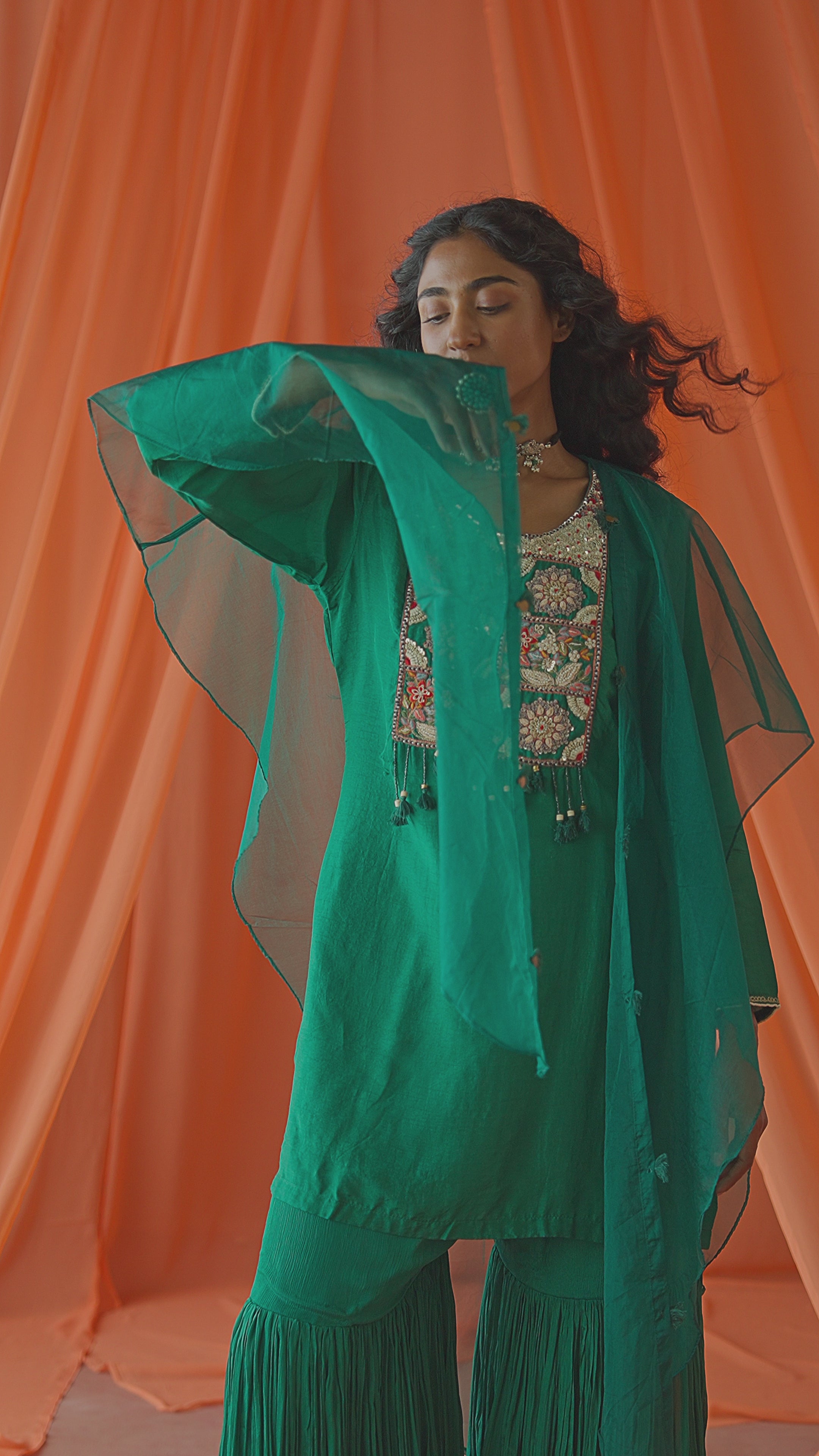 Grace your festive wardrobe with this stunning teal Green raw silk kurta and sharara set, paired beautifully with a net dupatta. The outfit features intricate embroidery work highlighted with beads, zari, and sequins. The elegant neckline design adds a rich ethnic touch. Perfect for festive gatherings, sangeet, or family functions.