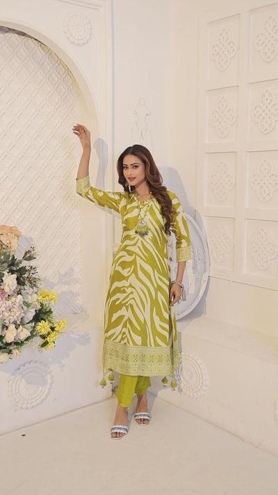 The kurta features a bold abstract zebra or tiger stripe pattern in shades of chartreuse green and off-white. The straight silhouette of the kurta is complemented by a detailed, patterned border at the hem, and tassels hang from the corners, adding a touch of a playful and traditional look. The Pant are a solid chartreuse green, matching the lighter shade in the kurta's print. the whole outfit a festive and elegant feel.