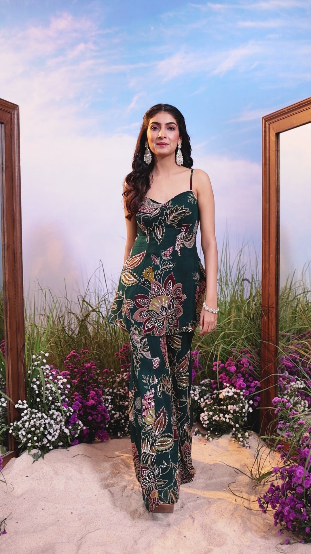 A luxurious Forest Georgette Silk Palazzo Set featuring a contemporary peplum-style short kurta with delicate straps and a highly embellished multicolor floral pattern, paired with wide-leg Palazzo pants featuring matching intricate detailing.