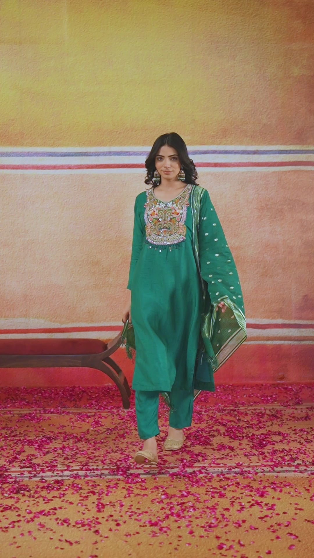 Introducing our Teal Green embroidered Raw Silk kurta. Expertly crafted with intricate sequin, bead, zari and thread handwork. Paired with matching solid pants and a Belgium silk dupatta. Apt for semi formal wear.