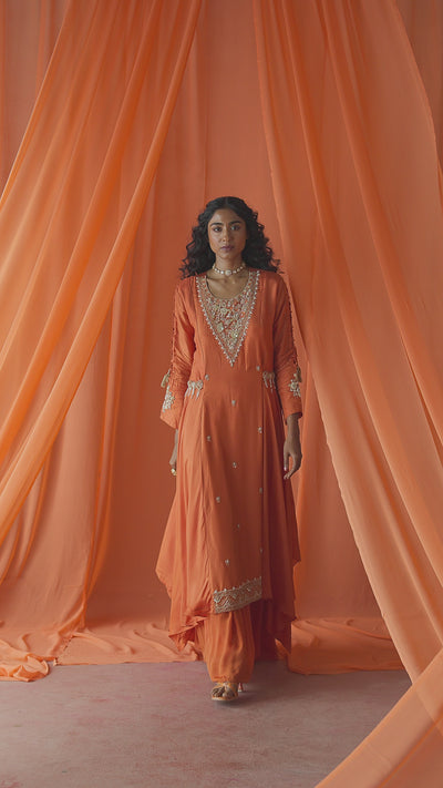 This elegant satin silk skirt set comes in a rich terracotta orange hue, perfect for festive occasions.