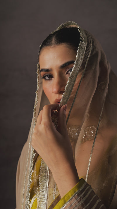 Paired with a lightweight organza dupatta that adds a sheer, flowy charm.