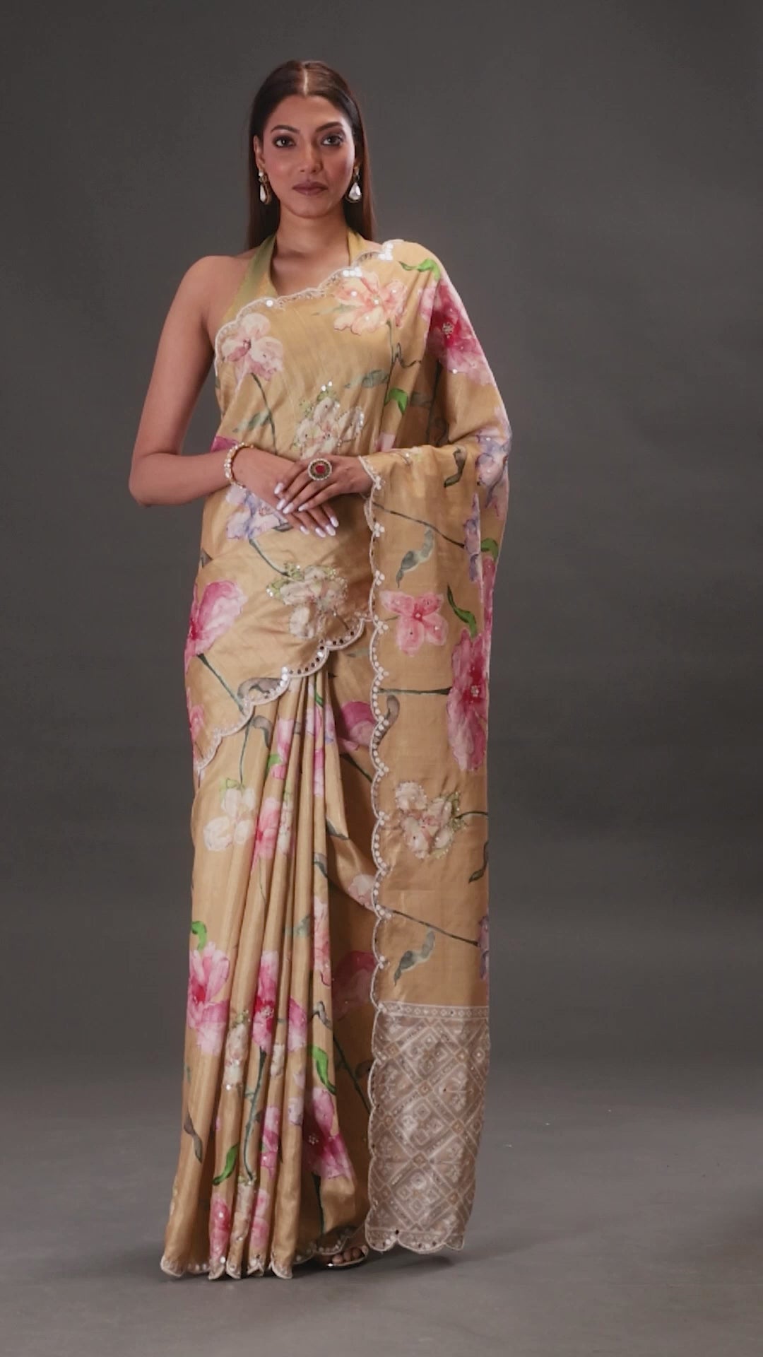 When elegance meets sophisticated charm than it turns out into our Golden Hour Tussar Silk Saree. Glamed up with enchanting floral prints, sequins and dazzling mirror work with scalloped border. An ensemble that makes an unforgettable entrance and leave a lasting impression at all your year-round festivities.