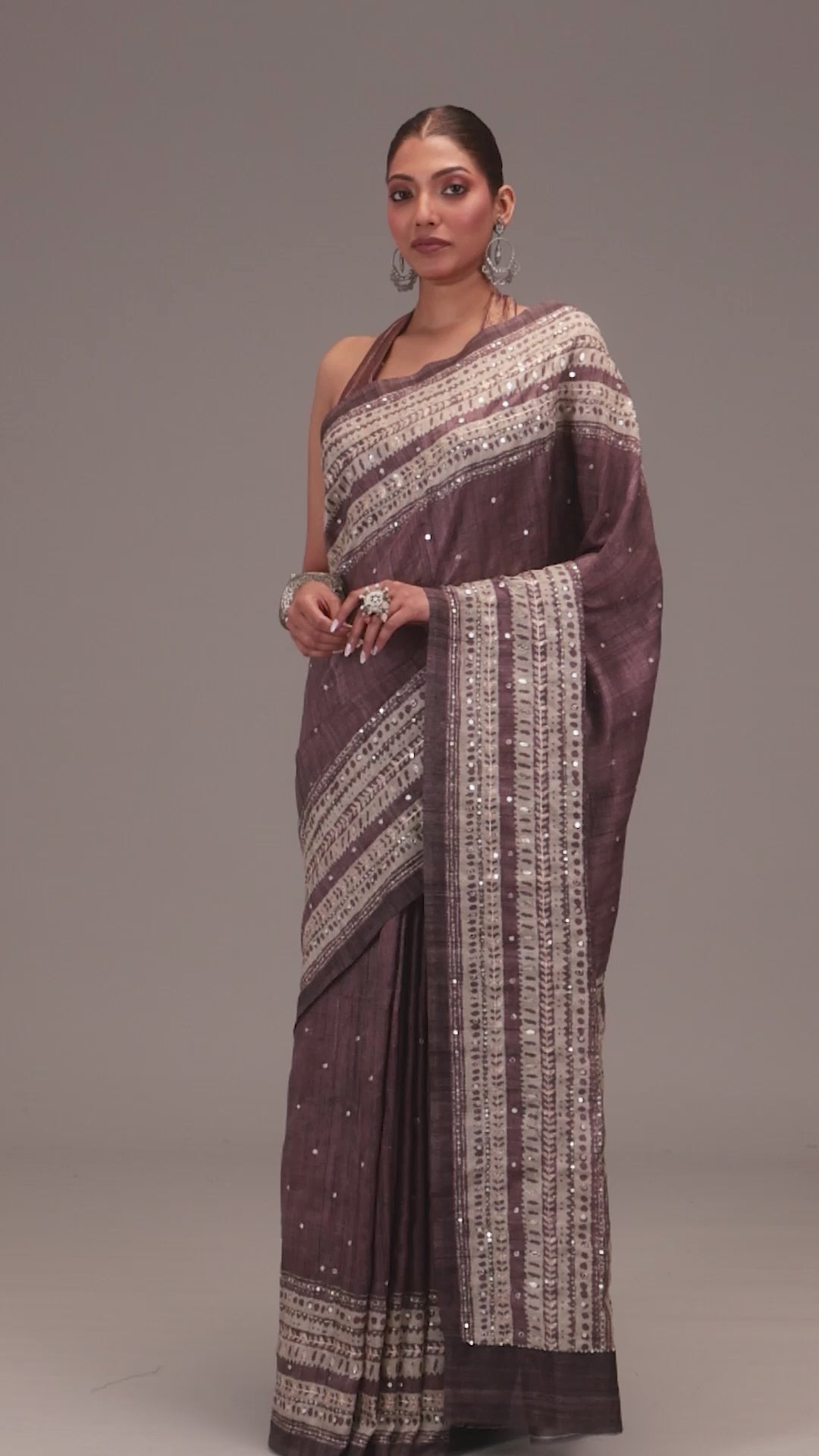When elegance meets sophisticated charm than it turns out into our Mauve Ethnic Printed Tussar Silk Saree. Glamed up with enchanting ethnic prints, sequins and aari tari work. An ensemble that makes an unforgettable entrance and leave a lasting impression at all your year-round festivities.