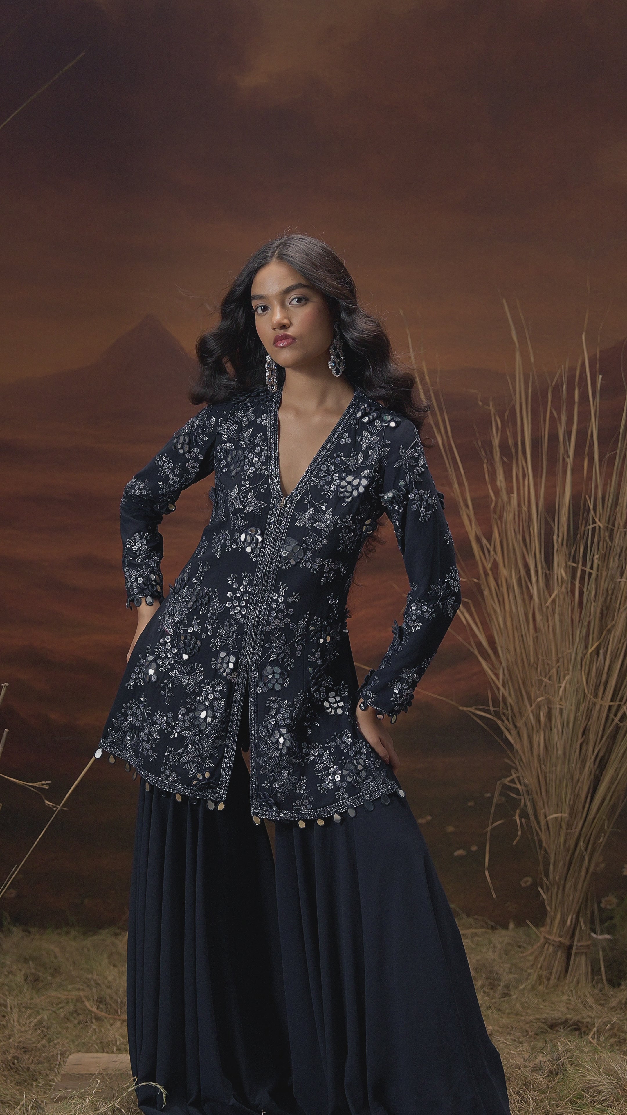 This elegant Twilight Blue georgette silk tunic and sharara set exudes festive charm with its rich, flowy silhouette. Intricately adorned with mirror work, beads, sequins, cut dana, and overall embellishment, the outfit offers a perfect blend of shimmer and tradition. The structured tunic and voluminous sharara make it ideal for evening occasions with a regal edge.