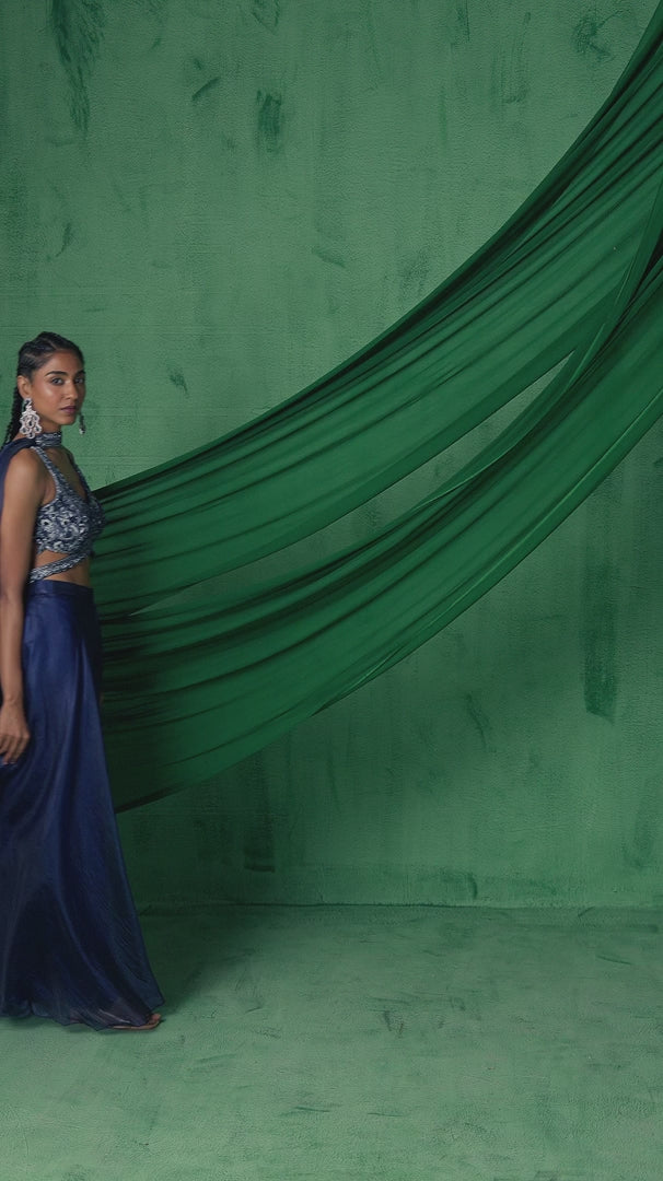 This stunning twilight blue outfit set includes a chic blouse, wide-leg palazzo, and ruffled dupatta, all crafted in luxurious tissue silk. The blouse is intricately adorned with cut dana, sequins, beads, and embellished detailing, and features tassels at the back for an added touch of elegance. The ruffled, embellished dupatta brings a dramatic flair to the ensemble. Perfect for festive occasions or evening celebrations.
