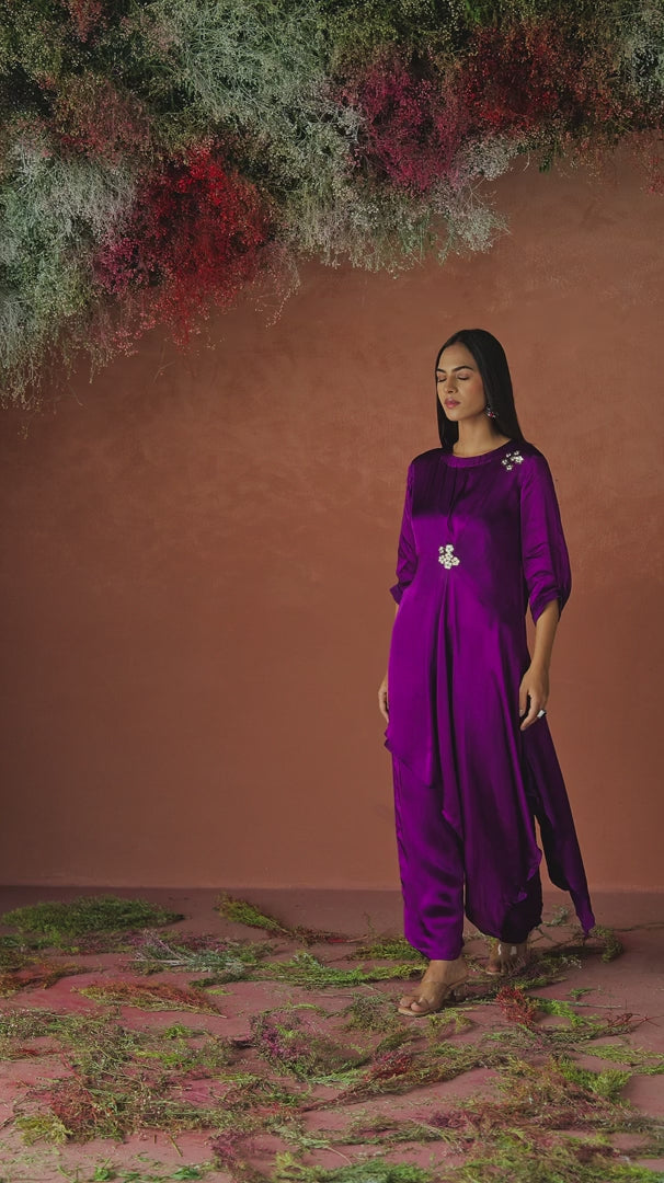 A vibrant satin silk asymmetrical kurta paired with fluid pants, radiating elegance in a rich jewel tone. The silhouette flows effortlessly with modern draping, while delicate beadwork, embellishments, and decorative accents add a refined sparkle. Perfect for festive occasions or evening affairs with a contemporary twist.